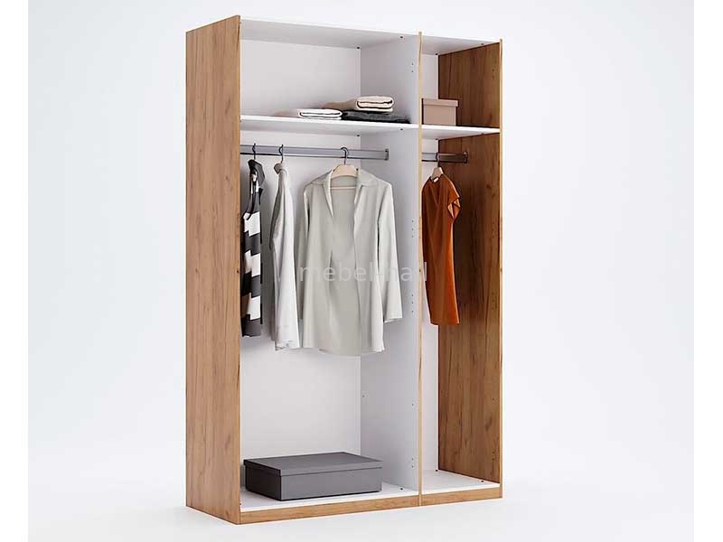 Внутри шкаф имеет два отделения. В каждом расположена штанга для вешалок и полка сверху.