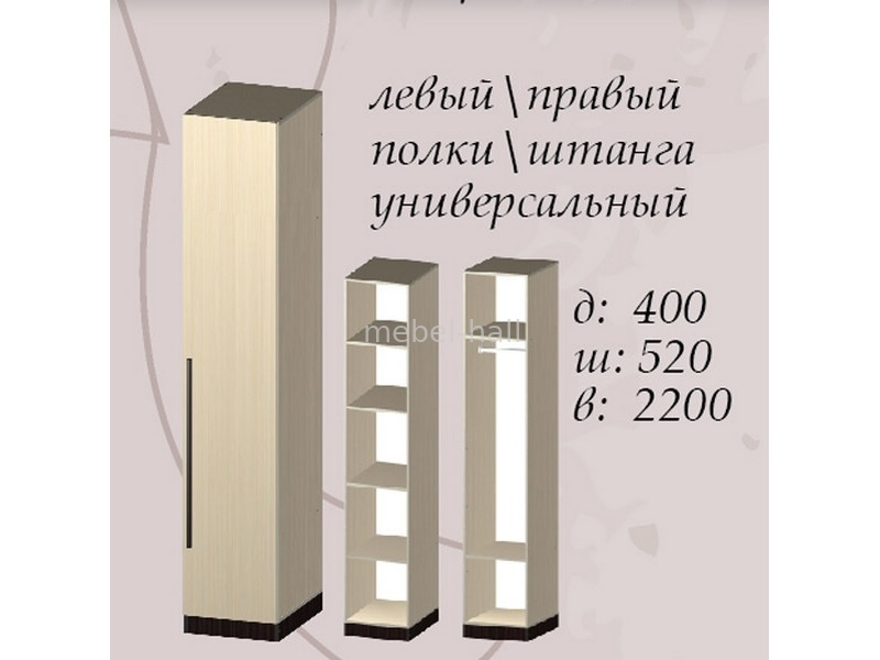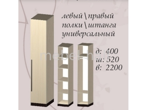 Расположение дверей универсальное, может быть как левое, так и правое. Наполнение внутри шкафа: только полки или штанга для вешалок и полочка сверху.