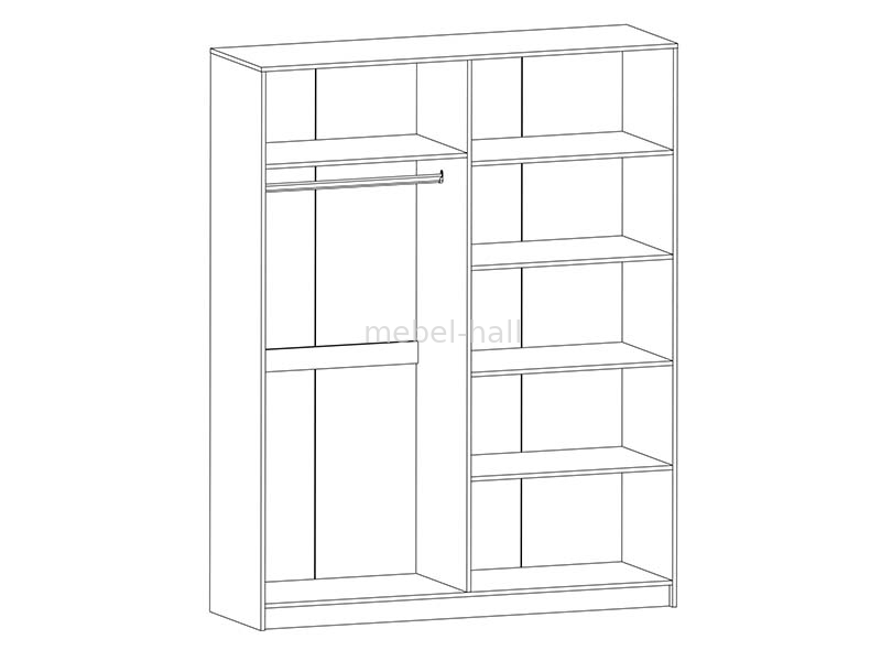 Внутри шкаф разделен на два отделения, в правом находятся пять полок одинаковой высоты, в левом - штанга для вешалок и полка сверху.