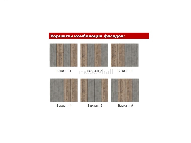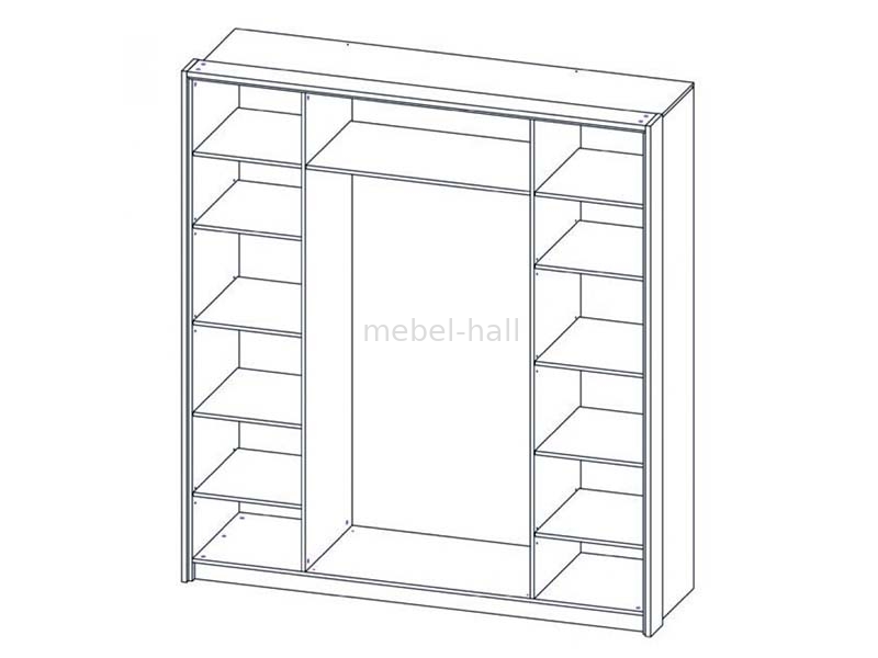 Шкаф Бари вместительный и функциональный. За дверьми расположены слева и справа 6 полок одинаковой высоты, посередине - полка сверху и штанга для вешалок. Есть возможность 6 вариантов комбинации фасадов.