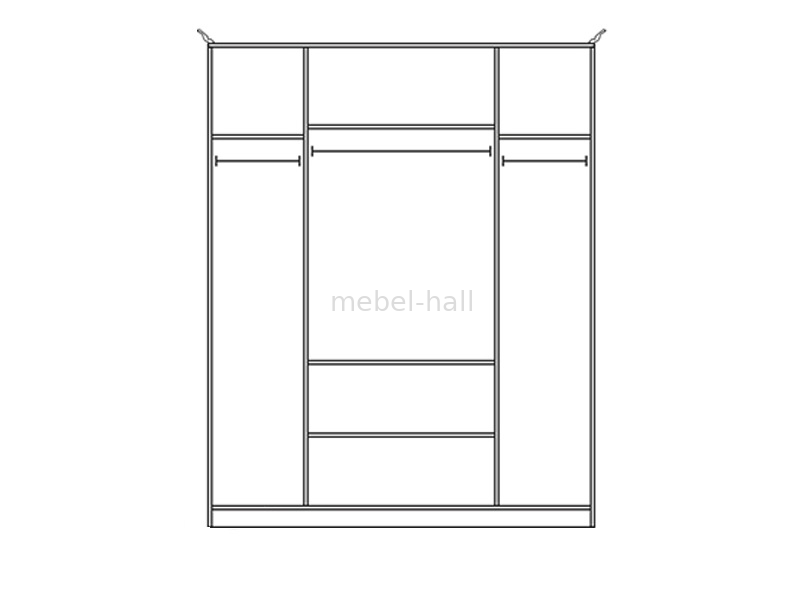 Шкаф разделен на три секции, в каждой их которых имеется штанга для вешалок и одна полка сверху, в средней еще расположены две большие полки внизу.