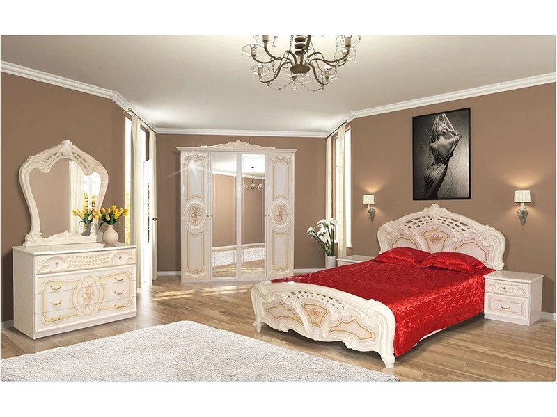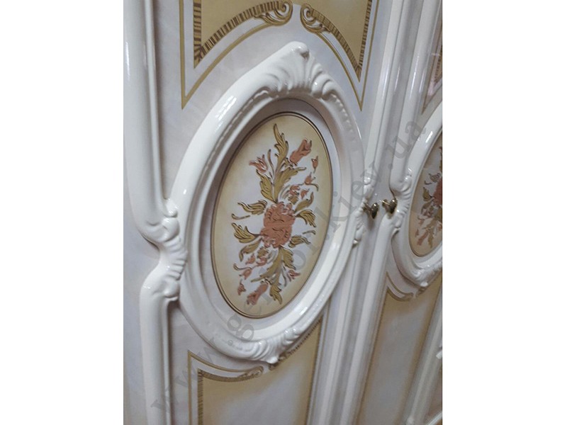 Фасад отлакированный, выполнен из ламинированного ДСП в цвете Пино Беж Лак + Художественная Печать + Декоративная Резьба в Белом цвете + Зеркала.