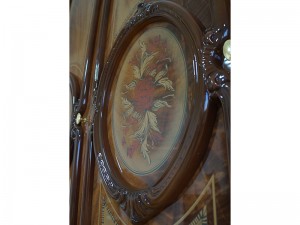 Фасад отлакированный, выполнен из ламинированного ДСП в цвете Пино Орех Лак + Художественная Печать + Декоративная Резьба в цвете Орех + Зеркала.