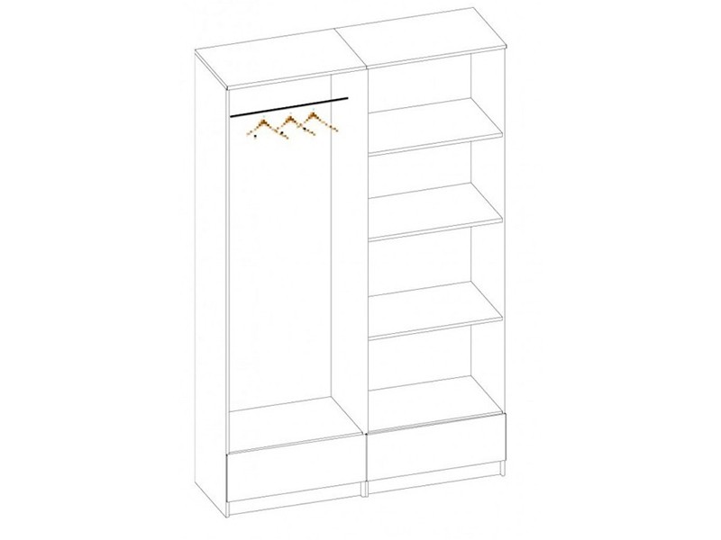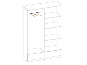 Внутри шкаф разделен на две секции: в правой части расположена штанга для вешалок, в правой - четыре полки одинаковой высоты.