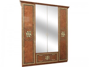 Шкаф Жасмин с четырьмя дверьми и двумя шухлядами Світ Меблів Пино Орех от украинской фабрики "Світ Меблів". Классический шкаф в итальянском стиле, характеризуется изысканным дизайном, роскошными формами с оригинальными ручкам, сочетающиеся с художественной росписью на фасадах и зеркалами. Шкаф разделен на три секции, в крайних имеется штанга для тремплей и одна полка, в средней - четыре полки одинаковой высоты и два выдвижных ящика. Выдвижные ящики на направляющих полного выдвижения, что гарантирует плавность при выдвижении и долговечность. Шкаф Жасмин достоин королевских апартаментов.