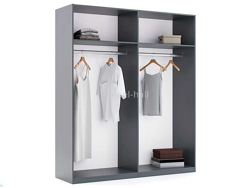 Внутри шкаф имеет два отделения. В каждом расположена штанга для вешалок и полка сверху.