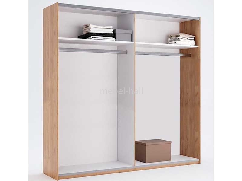 Внутри шкаф имеет два отделения. В каждом расположена штанга для вешалок и полка сверху.