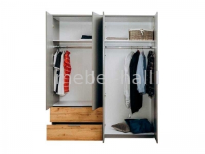 Внутри шкаф имеет два отделения, в которых расположены штанги для вешалок и полки сверху.