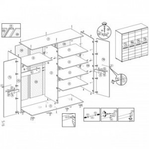 Модель оснащена четырьмя дверьми и разделена на две секции: в правой секции размещены пять полок одинаковой высоты, в левой - ниша с штангой для верхней одежды и полка сверху для головных уборов.
