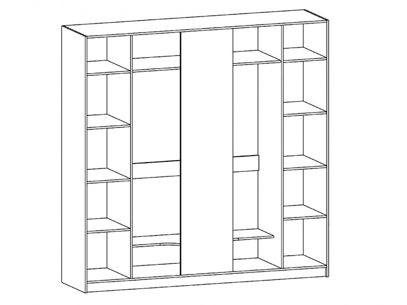 Шкаф внутри разделен на три секции: в крайних расположены 5 полок одинаковой высоты, в средней - полка сверху и штанга для вешалок.