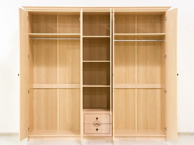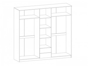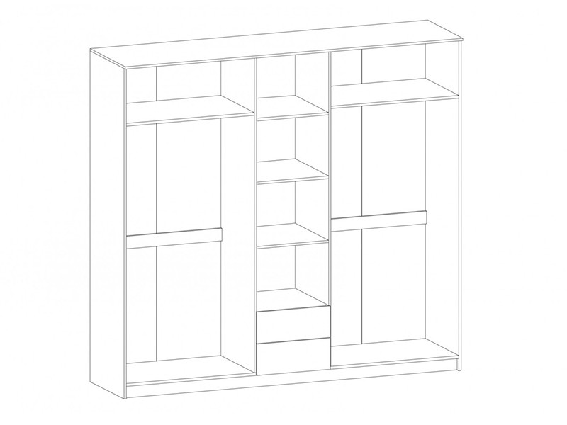 Внутри шкаф имеет три отделения: в среднем расположены 4 полки одинаковой высоты и 2 выдвижных ящика, в крайних - штанга для вешалок, полка сверху.