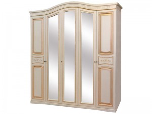 Шкаф Николь с пятью дверьми Світ Меблів от украинской фабрики "Світ Меблів". Классический шкаф в итальянском стиле, характеризуется изысканным дизайном, роскошными формами с оригинальными ручкам, стилизованными под медь, сочетающиеся с декоративной резьбой и патиной (эффектом старения) на фасадах и зеркалами. Шкаф разделен на три секции, в крайних имеется штанга для тремплей и одна полка, в средней - пять полок одинаковой высоты. Шкаф Николь достоен королевских апартаментов.