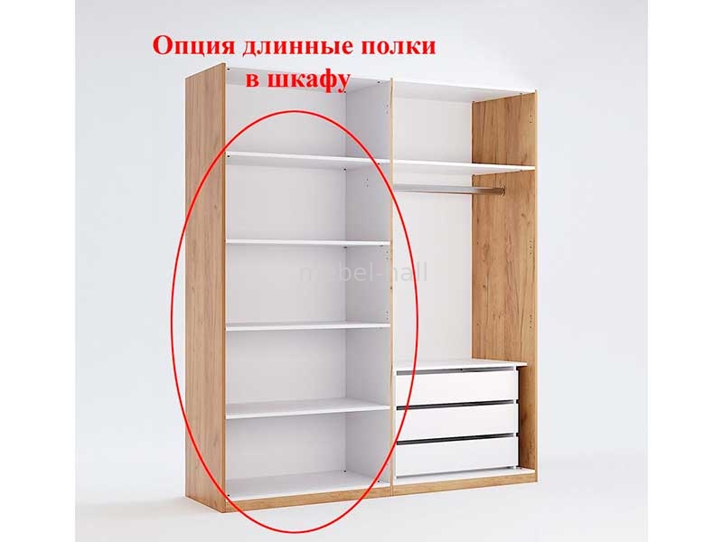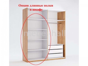 Внутри шкаф имеет три отделения, в двух из которых расположены штанги для вешалок и полки сверху. В крайнем отделении расположены пять полок одинаковой высоты.