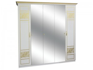 Шкаф Полина Новая с пятью дверьми Світ Меблів Белый от украинской фабрики "Світ Меблів". Классический шкаф в итальянском стиле, характеризуется изысканным дизайном, роскошными формами с оригинальными ручкам, сочетающиеся с художественной росписью на фасадах и зеркалами. Шкаф имеет три секции, крайние секции имеют штангу для тремплей и одну полку сверху, средняя - пять полок одинаковой высоты. Шкаф Полина Новая достоин королевских апартаментов.