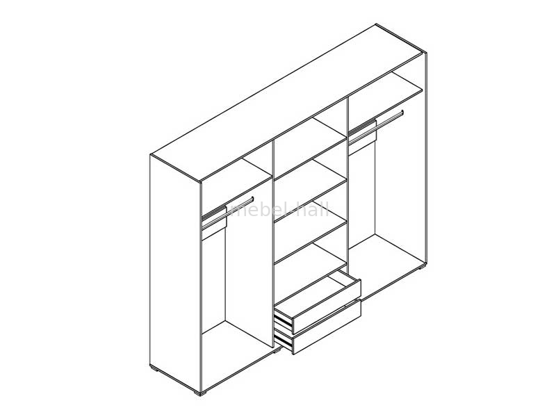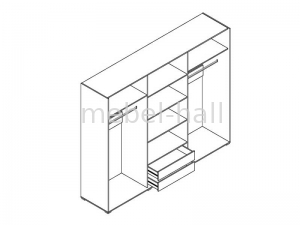 Внутри шкаф имеет три отделения. Справа и слева расположены штанги для вешалок и полка сверху, посередине - четыре полки одинаковой высоты и два выдвижных ящика на направляющих полного выдвижения.