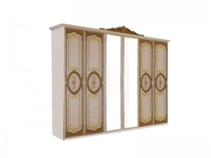 Шкаф Кармен Новая с шестью дверьми и зеркалами Світ Меблів Пино Золото от украинской фабрики "Світ Меблів". Классический шкаф в итальянском стиле, характеризуется изысканным дизайном, роскошными формами с изящной декоративной резьбой и оригинальными ручкам, сочетающиеся с художественной росписью на фасадах. Внутри шкаф разделен на четыре секции: в крайних нишах расположены пять полок одинаковой высоты, в средних - штанга для тремплей и одна полка. Шкаф Кармен Новая достоин королевских апартаментов.