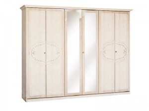 Шкаф Опера с шестью дверьми Світ Меблів Роза от украинской фабрики "Світ Меблів". Классический шкаф в итальянском стиле, характеризуется изысканным дизайном, роскошными формами с изящной художественной печатью на фасадах и зеркалами на центральных дверях. В середине шкаф разделен на три секции, в каждой из них размещена ниша с штангой для тремпелей, в крайних имеется одна полка вверху, а в средней - полка внизу. Шкаф Опера достоин королевских апартаментов.