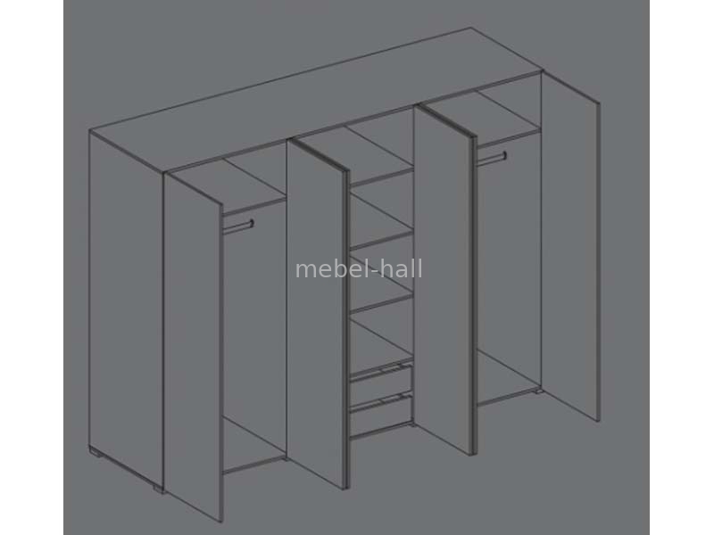 Внутри шкафа расположены 3 отделения. В боковых отделениях находится штанга для вешалок и полка сверху. В среднем отделении расположены 4 полки одинаковой высоты и внизу 2 выдвижных ящика на направляющих полного выдвижения.
