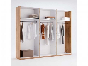 Внутри шкаф имеет три отделения. В каждом расположена штанга для вешалок и полка сверху.