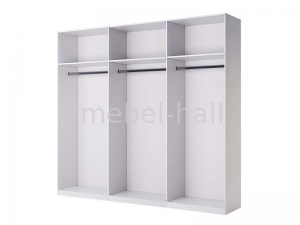 Внутри шкаф имеет три отделения. В каждом расположена штанга для вешалок и полка сверху.