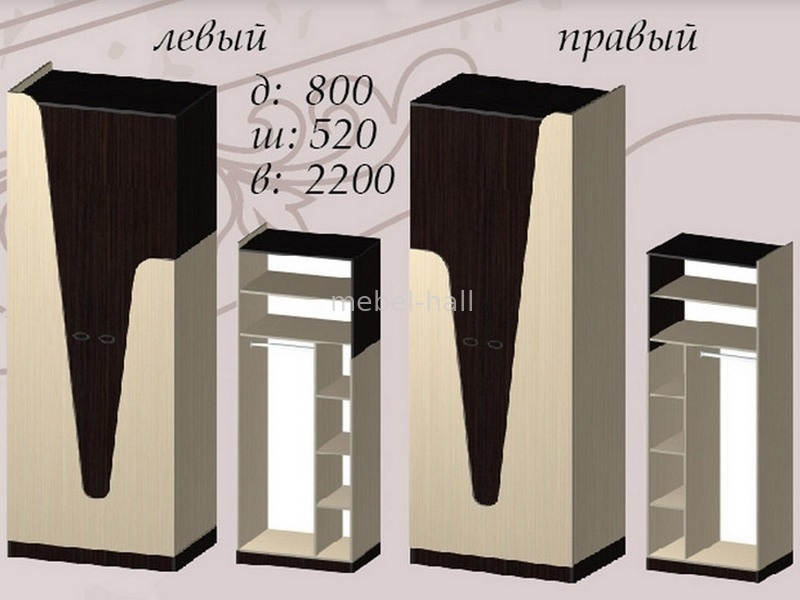 Расположение дверей левое/правое. Наполнение внутри шкафа: полки, штанга для вешалок и полки сверху.