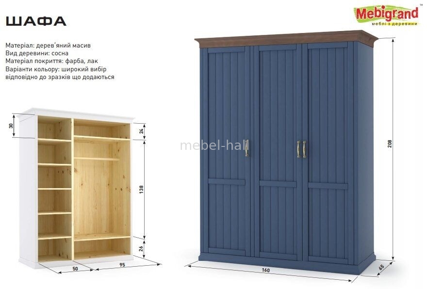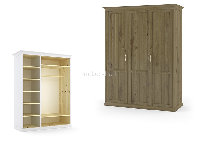 В ассортименте спальной мебели фабрики Мебигранд присутствует распашной шкаф из массива сосны, который можно приобрести в комплекте с кроватью, комодом и прикроватными тумбочками в свою уютную спальню. Таким образом Ваш гарнитур будет экологично чистым и выполнен в одном стиле с одинаковой окраской.