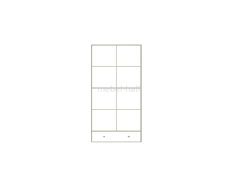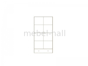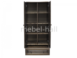 Шкаф имеет 2 двери и выдвижной ящик внизу, внутри за каждой из дверей расположены 4 полки одинаковой высоты.