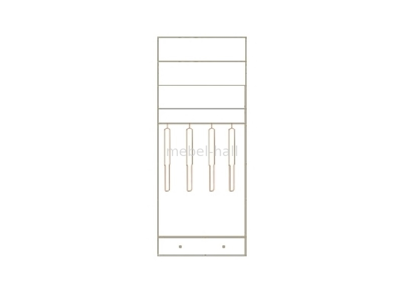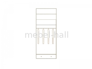 Шкаф имеет 4 двери и выдвижной ящик внизу, внутри расположена штанга для вешалок, сверху антресоль имеет 2 полки.