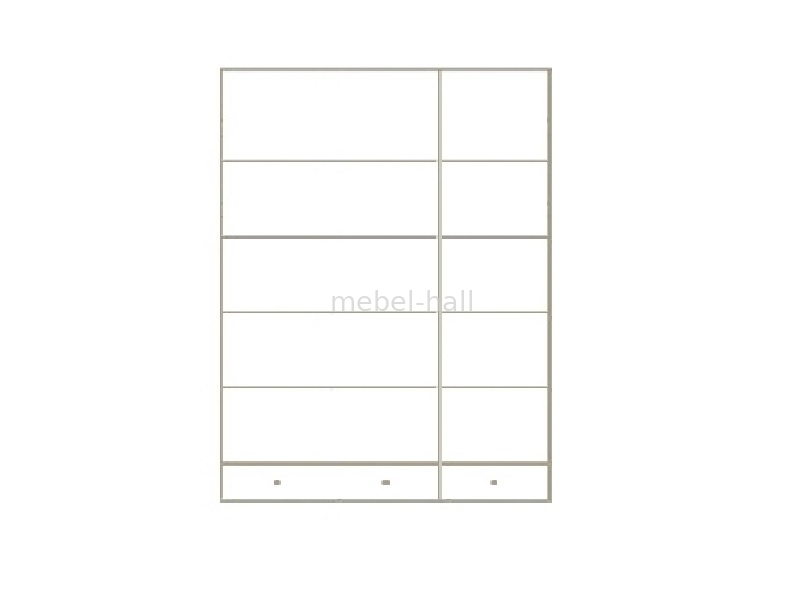Шкаф имеет 3 двери и 2 выдвижных ящика внизу, внутри с обеих сторон расположены по 4 полки одинаковой высоты, антресоль имеет одну большую полку.