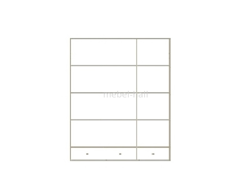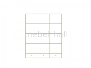 Шкаф имеет 3 двери и 2 выдвижных ящика внизу, внутри с обеих сторон расположены по 4 полки одинаковой высоты.