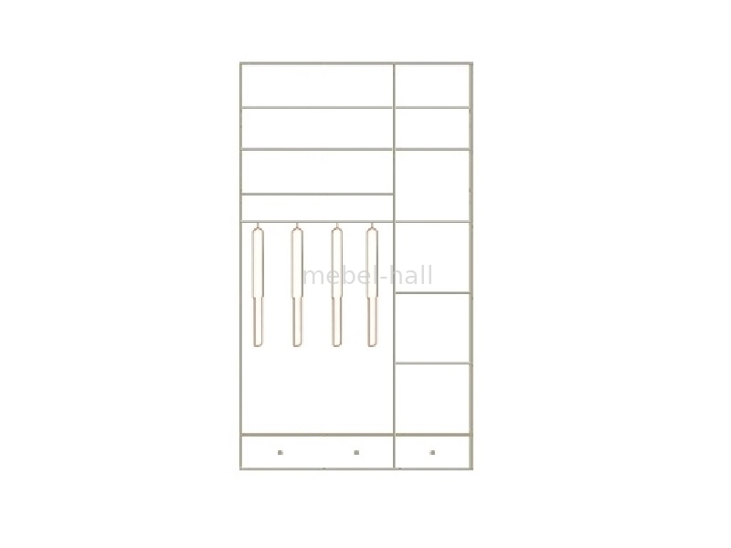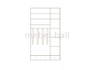 Шкаф имеет 3 двери и 2 выдвижных ящика внизу, слева внутри расположена штанга для вешалок, справа - 4 полки одинаковой высоты, антресоль имеет 2 полки с каждой стороны одинаковой высоты.