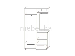Прихожая укомплектована выдвижными ящиками, высоким шкафом с полкой и крепкой вешалкой, зеркалом и открытыми полками.