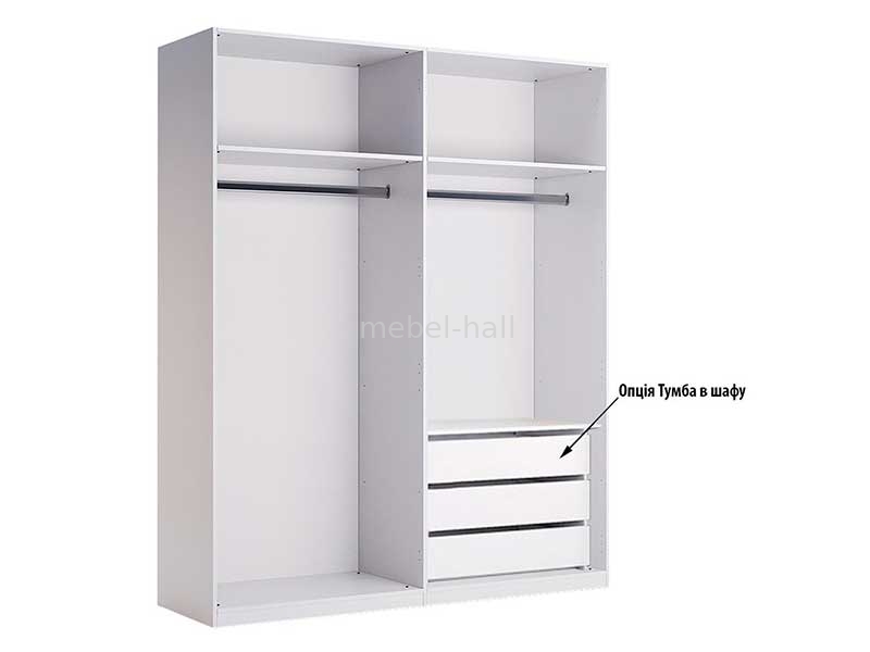 Внутри шкаф имеет два отделения. В каждом расположена штанга для вешалок и полка сверху.
