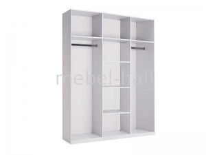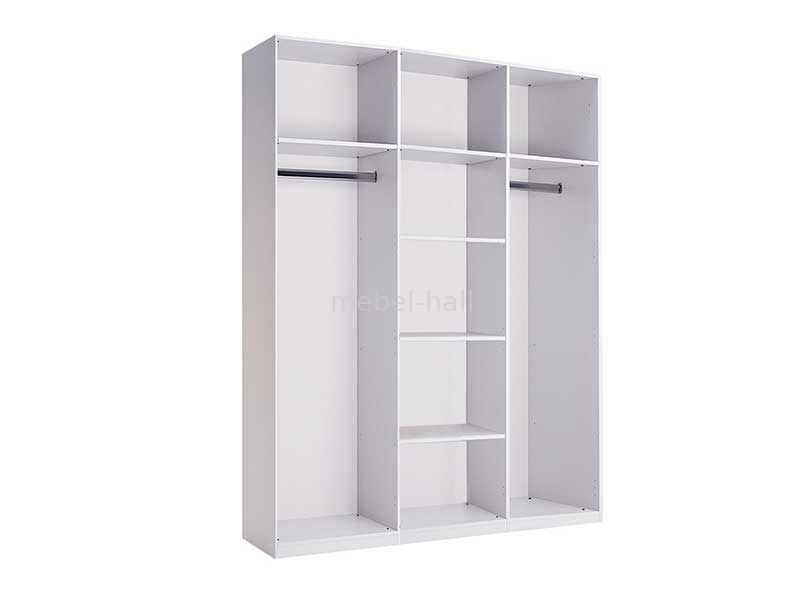 Внутри шкаф имеет три отделения. В двух крайних расположена штанга для вешалок и полка сверху, в среднем - пять полок одинаковой высоты.