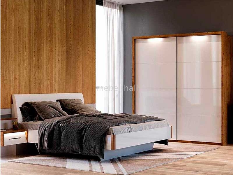 Модульная мебель для спальни Ники в современном стиле, с гармоничным сочетанием белоснежных глянцевых фасадов и корпуса в благородном натуральном дереве дуб крафт, от украинской мебельной фабрики MiroMark.