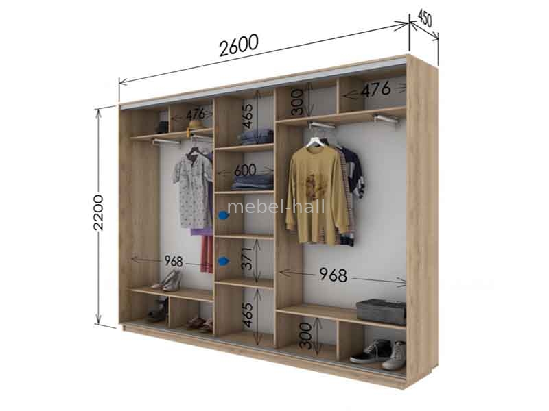 Размер: ширина 2,6 метра; высота 2,4 метра; глубина 0,6 метра. Фасады на выбор: фотопечать, лакобель, ДСП ламинированное, зеркало, зеркало плюс ДСП. Шкаф купе есть на складе, звоните уточняйте цвет. Можем изготовить под заказ, после выбора наполнения фасадов.