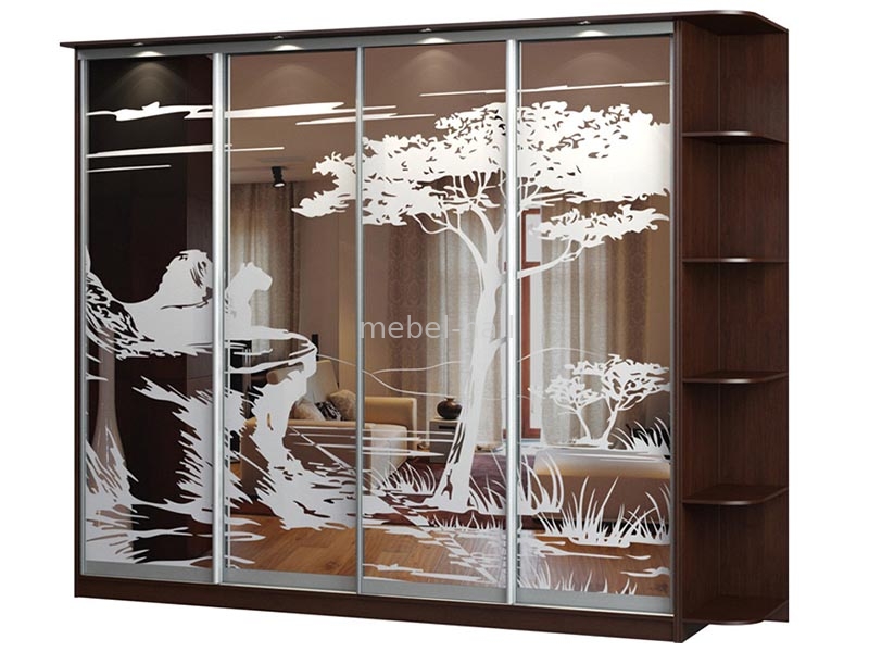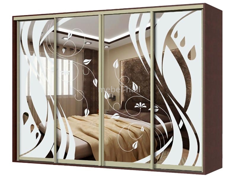 Четырехдверный шкаф купе в от фабрики производителя Влаби размер Ш 260*В 240*Г 60 см с пескоструйными узорами на фасадами на специальных регулируемых ножках.