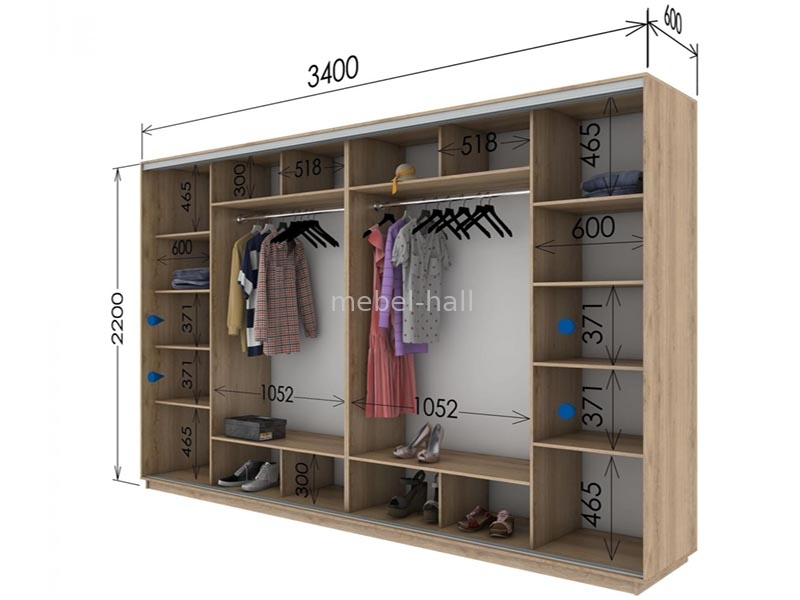 Размер: ширина 3,4 метра; высота 2,2 метра; глубина 0,60 метра. Фасады на выбор: фотопечать, лакобель, ДСП ламинированное, зеркало, зеркало плюс ДСП. Шкаф купе есть на складе, звоните уточняйте цвет. Можем изготовить под заказ, после выбора наполнения фасадов.