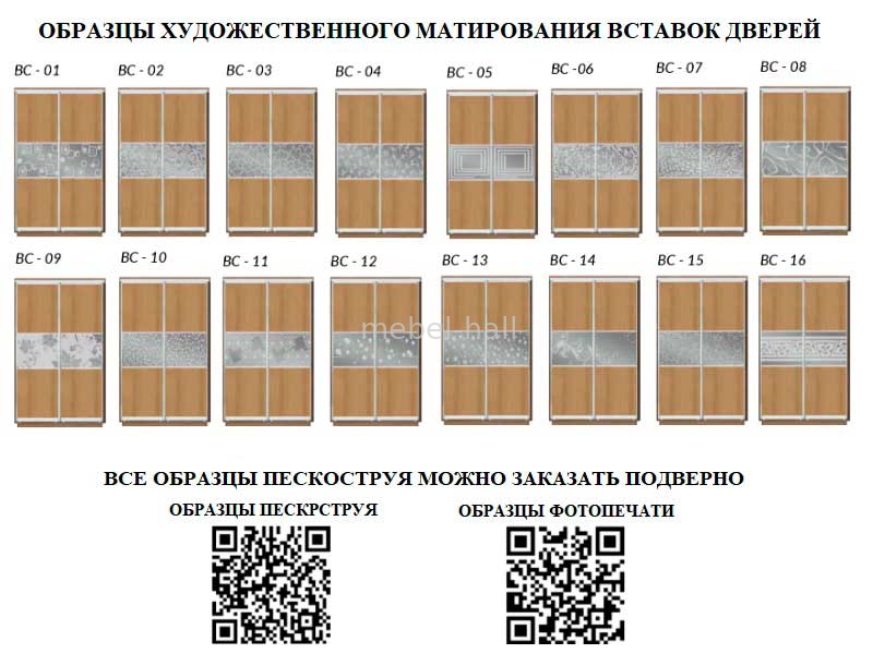 | Тип фасадов ШК: | Зеркало Серебро, ДСП ламинированное, Пескостуйный Узор, Лакобель, Фотопечать, Зеркало с декором, Зеркало Графит, Зеркало Бронза, Комби зеркало с ДСП, Комби зеркало фотопечать, Комби зеркало лакобель |