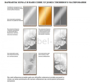 | Тип фасадов ШК: | Зеркало Серебро, ДСП ламинированное, Пескостуйный Узор, Лакобель, Фотопечать, Зеркало с декором, Зеркало Графит, Зеркало Бронза, Комби зеркало с ДСП, Комби зеркало фотопечать, Комби зеркало лакобель |