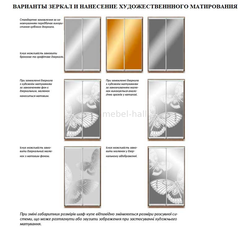 | Тип фасадов ШК: | Зеркало Серебро, ДСП ламинированное, Пескостуйный Узор, Лакобель, Фотопечать, Зеркало с декором, Зеркало Графит, Зеркало Бронза, Комби зеркало с ДСП, Комби зеркало фотопечать, Комби зеркало лакобель |