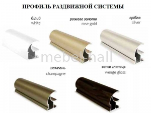 Профиль раздвижной системы доступен в таких цветах: Белый, Розовое Золото, Серебро, Шампань, Венге Глянец.