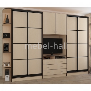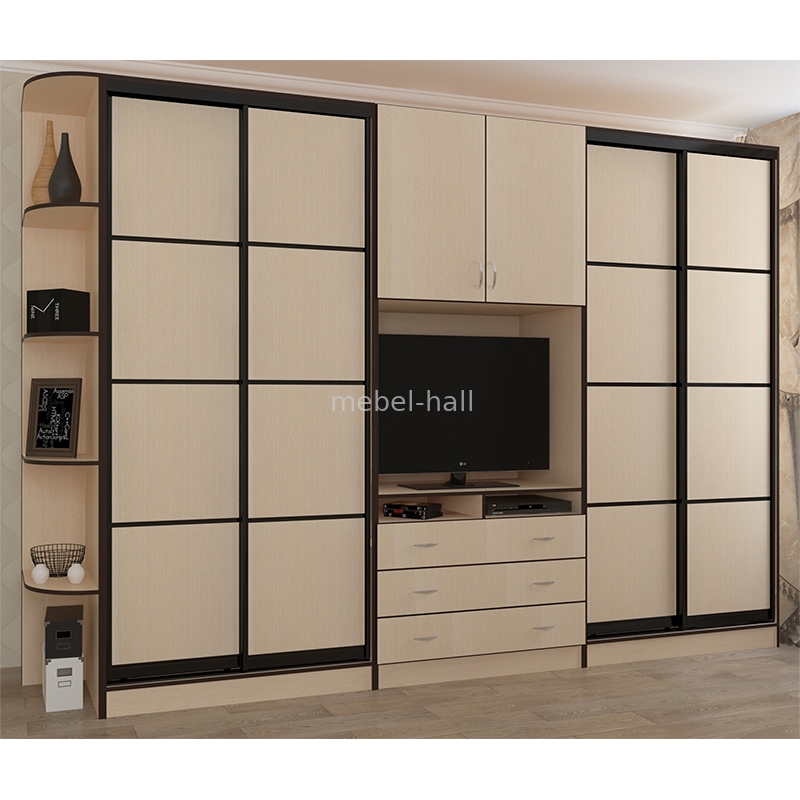 Модульный шкаф купе с нишей под телевизор и тремя выдвижными ящиками
