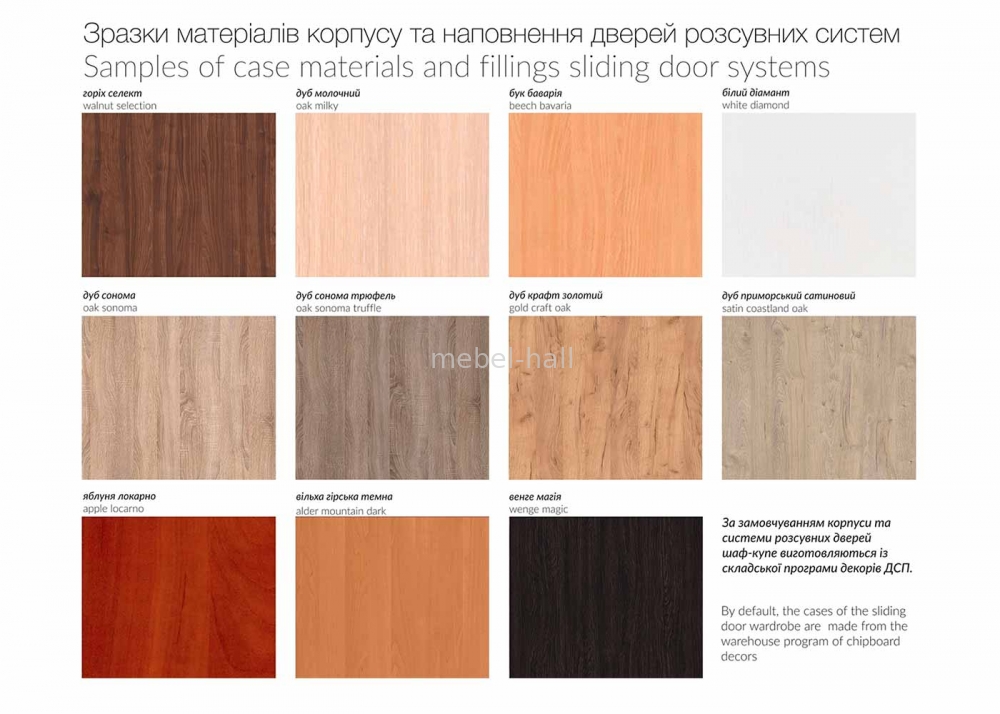 Стандартные цвета : Белый, Бук, Венге Темный, Венге Светлый, Вишня, Дуб Молочный, Дуб Сонома, Ольха, Орех Лесной, Орех Темный, Дуб Сонома Трюфель, Яблоня, Шамони Темный.