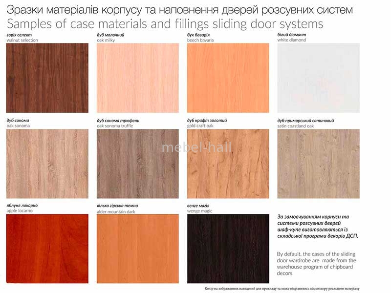 Стандартные цвета : Белый, Бук, Венге Темный, Венге Светлый, Вишня, Дуб Молочный, Дуб Сонома, Ольха, Орех Лесной, Орех Темный, Дуб Сонома Трюфель, Яблоня, Шамони Темный.