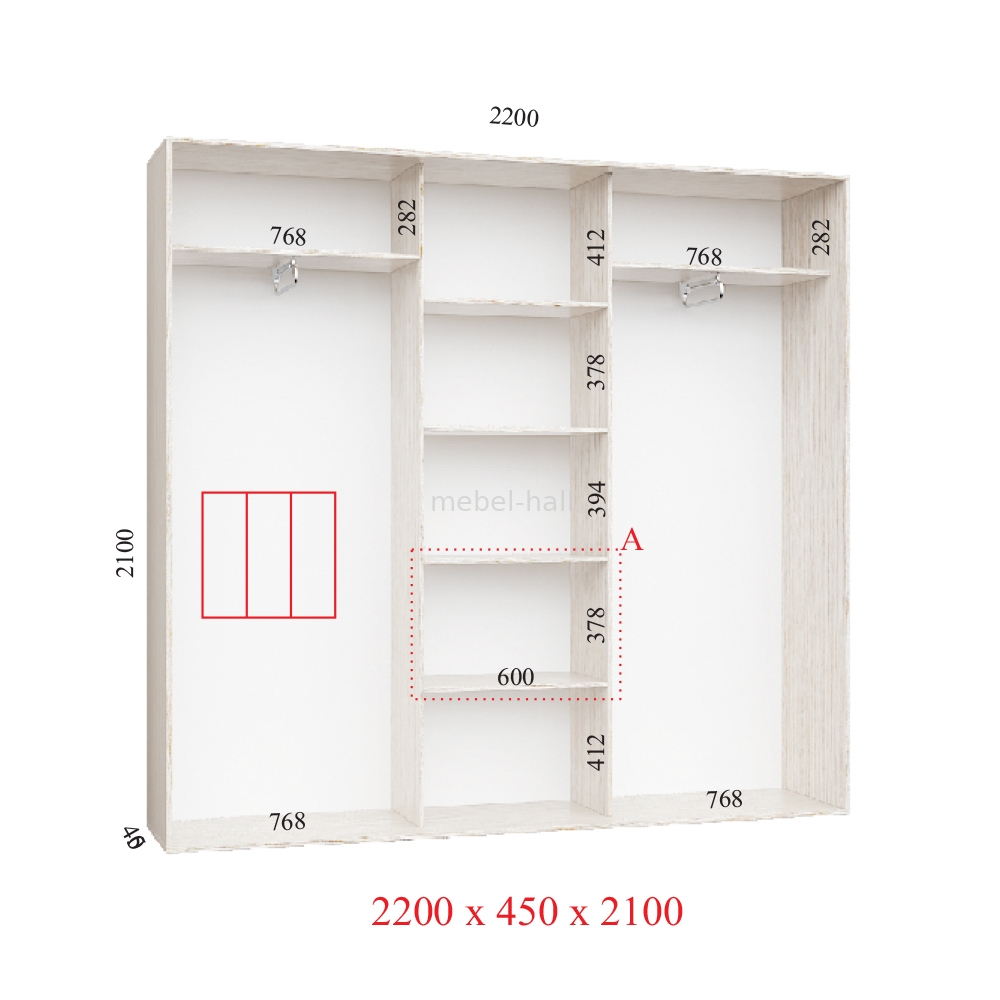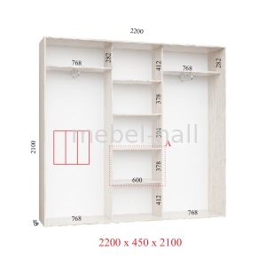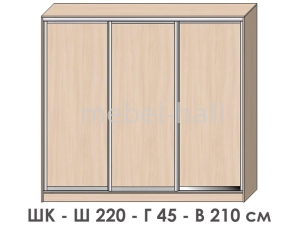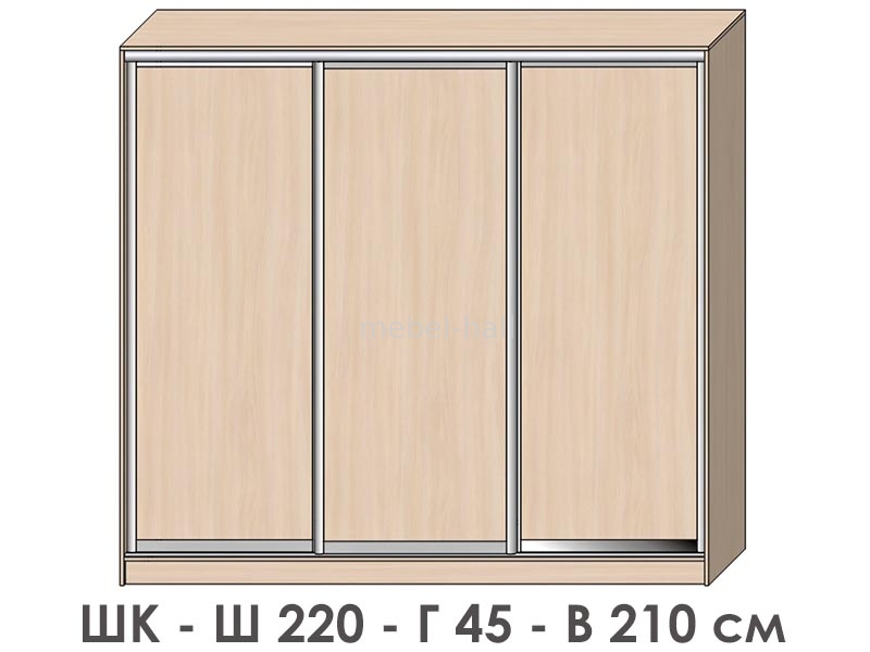 Предлагаем Вам шкаф-купе на три двери, в размере: ширина 2,2 метра; высота 2,1 м; глубина 0,45 м.