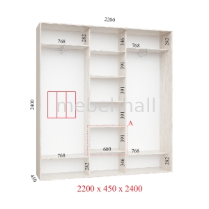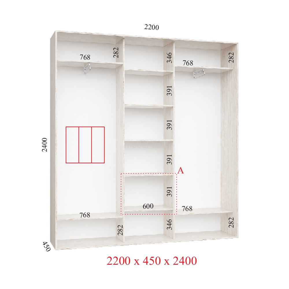 Предлагаем Вам шкаф-купе на три двери, в размере: ширина 2,2 метра; высота 2,4 м; глубина 0,45 м.