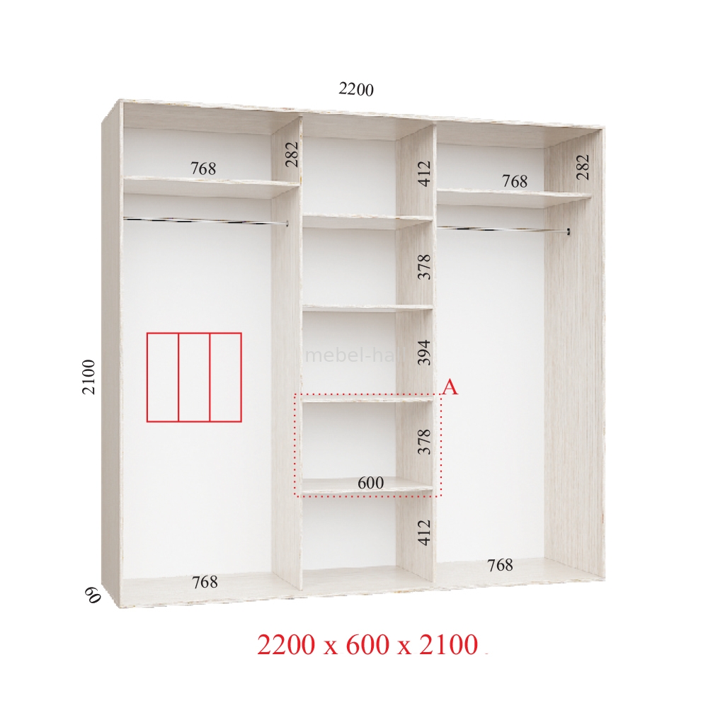 Предлагаем Вам шкаф-купе на три двери, в размере: ширина 2,2 метра; высота 2,1 м; глубина 0,6 м.