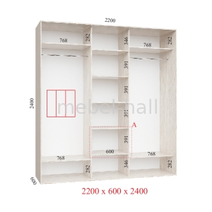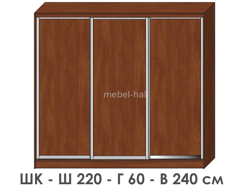 Предлагаем Вам шкаф-купе на три двери, в размере: ширина 2,2 метра; высота 2,4 м; глубина 0,6 м.
