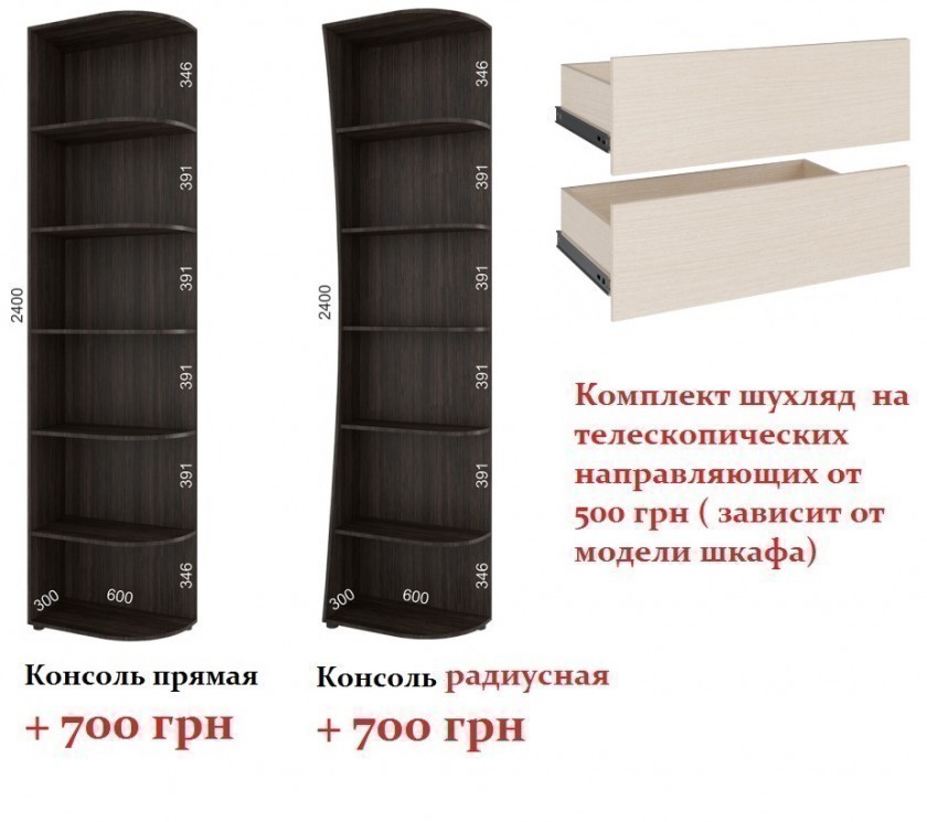 Внимание! Можем бесплатно рассчитать Ваш проект, достаточно фото эскиза или рисунка с размерами от руки, нужно указать цвет системы, наполнение фасадов, количество шухляд, поворотной консоли (прямая или радиусная), карниза и светодиодной подсветки (по количеству дверей) .